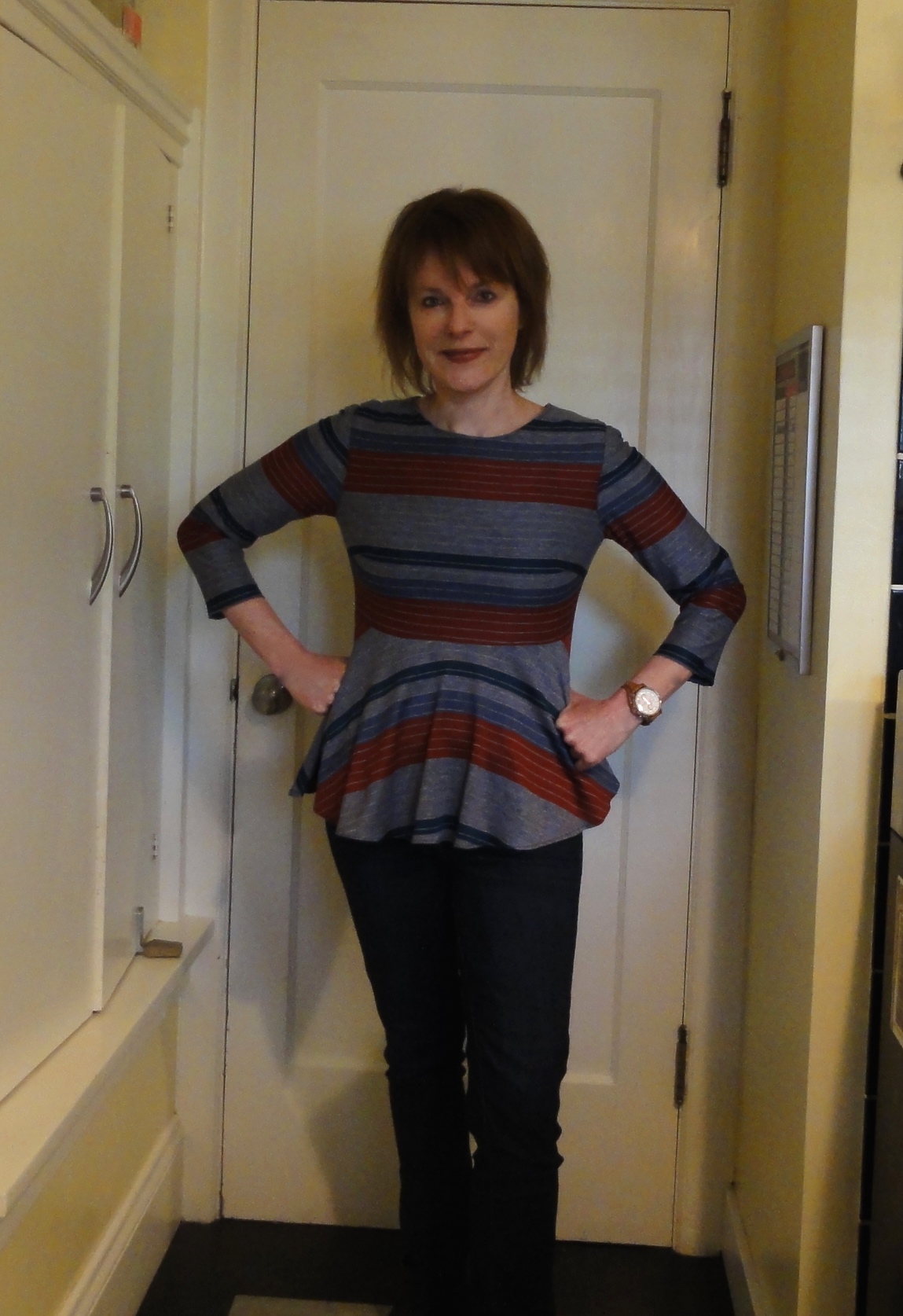 The pattern was easy to lay out, in spite of the inherent care that’s necessary when you are working with stripes. It was super fast and easy sew to sew too, as it has only four (!) pattern pieces. What’s not to like about that? The hem of the garment is machine stitched, as are the sleeve hems. The neck is finished similarly, so it’s an easy sew. Time from cut to finish was about three hours.Even though my knit had moderate stretch, it worked well for the pattern. It’s a lightweight fabric with a nice drape, which is important given the top’s bottom flounce.