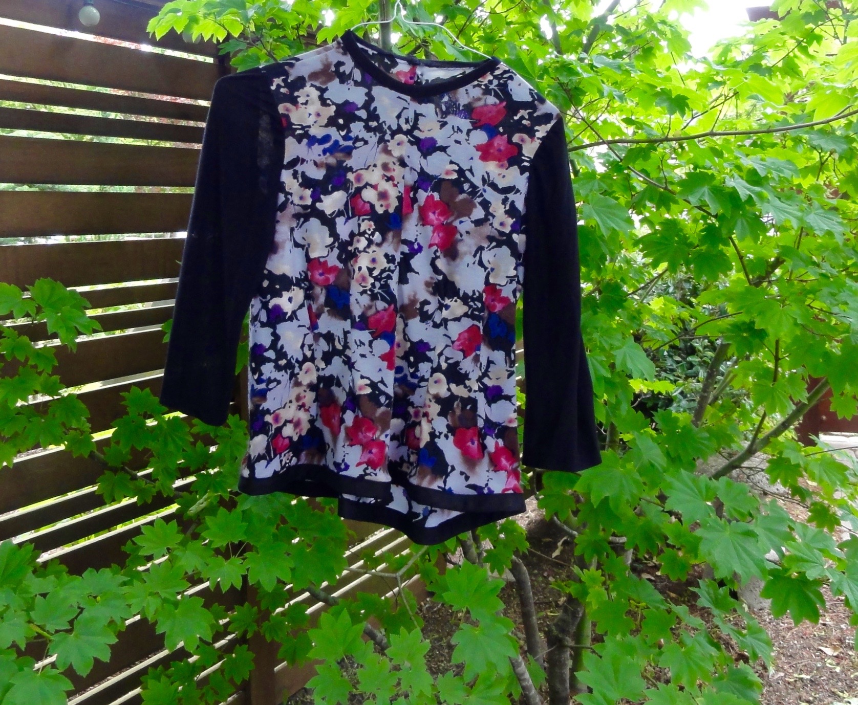 To balance out the floral’s intrinsic sweetness, I cut the sleeves from a contrast fabric, a black solid. I also used black binding at the neck, and at the hem to give the tee a bit more edge and shape.