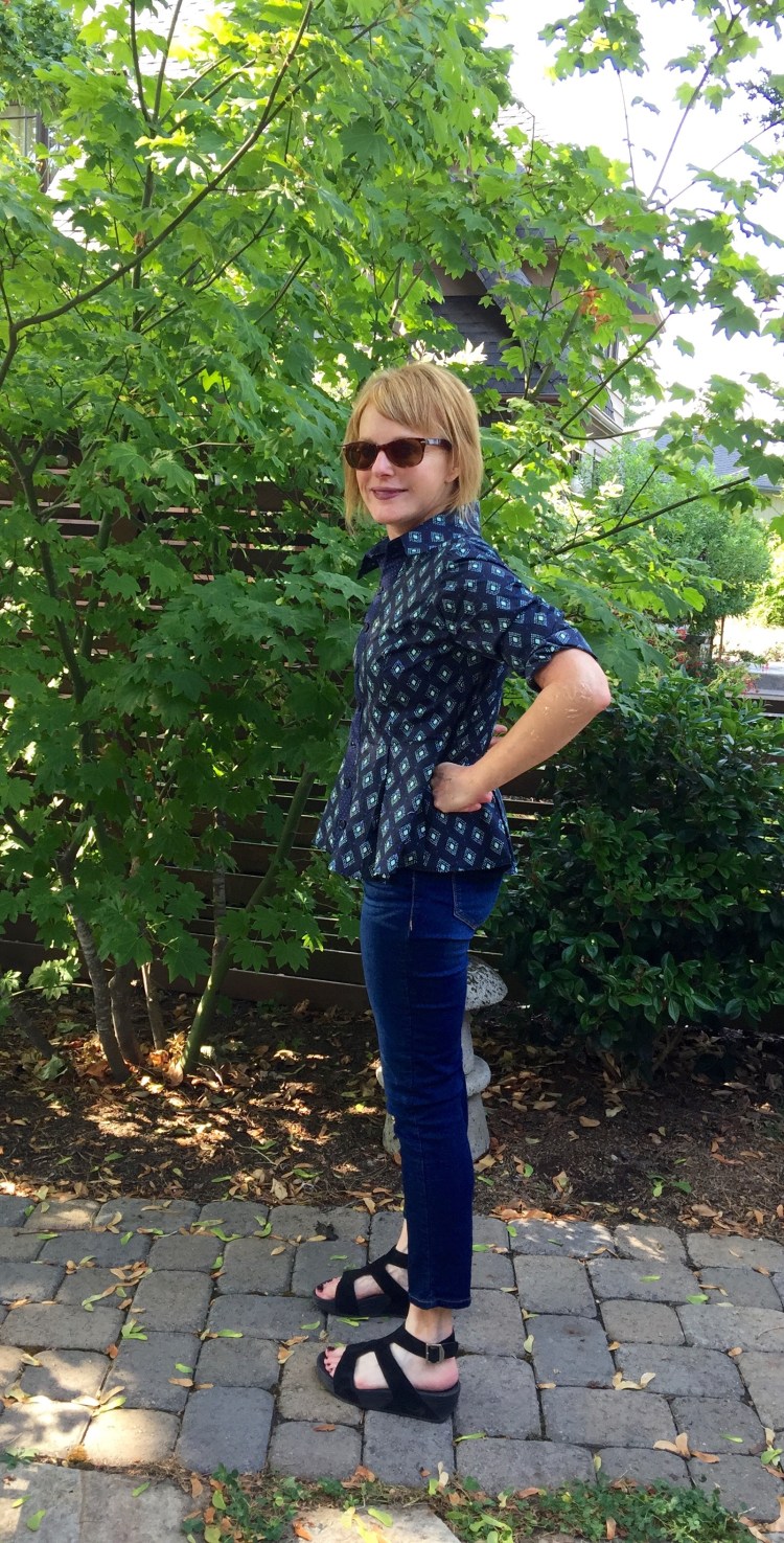 For a DIY peplum shirt with contrasting prints, visit Ellegeemakes.com