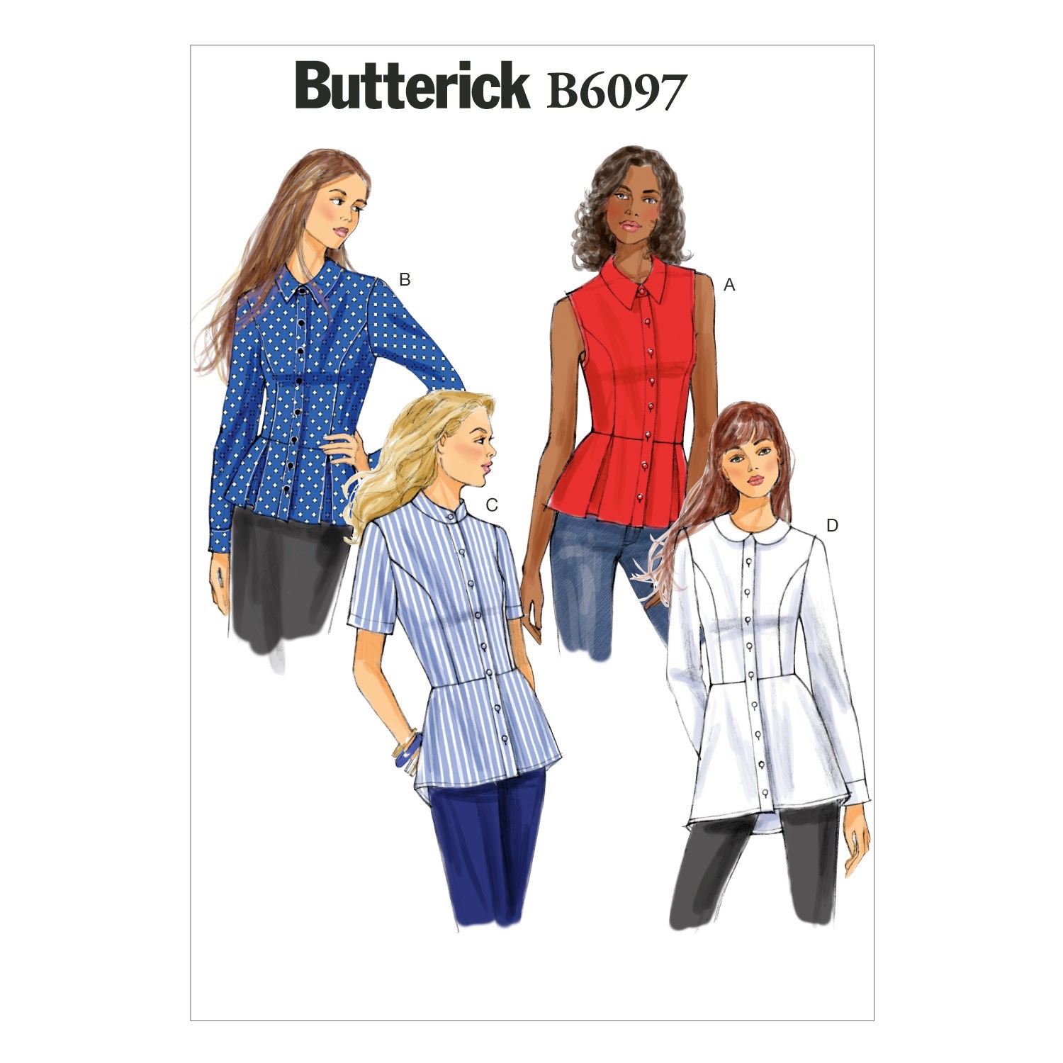 Butterick 6097, a fitted shirt with a collar and peplum variations, princess seams and a front button band.