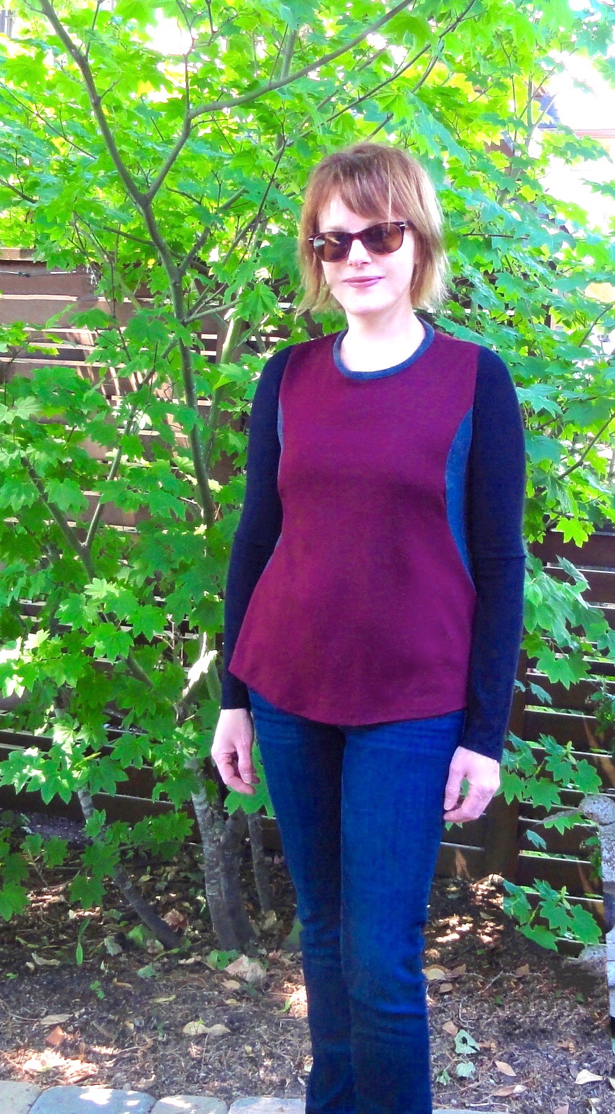 The Merlot ponte in my stash was perfect for a tee, but there wasn’t enough for a long sleeved style (so typical…), so I was forced to color block (Yes, I’m a fool for it), mixing my wine-colored fabric with accents of black and gray.