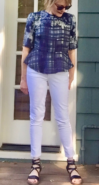 This is view B, the peplum bodice with a modified sleeve (no ruffle). Silk is so fabulous to wear – – I don’t know why I don’t treat myself to its luxury more often. I like this peplum because it isn’t too flouncy. For this version, I shortened the waist by 5/8 of an inch because the peplum is supposed to hit above the waist.