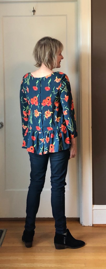 Construction: The button back detail looks harder than it is. The tab for the buttons is made by folding the fabric twice and stitching. The toughest part is the buttons and button holes which I made with my machine. Fit was easy because it’s a loose fitting pattern. The neck is finished with bias binding…also quite easy! The top came together in three hours including pattern layout and cutting.