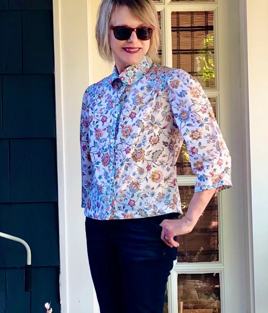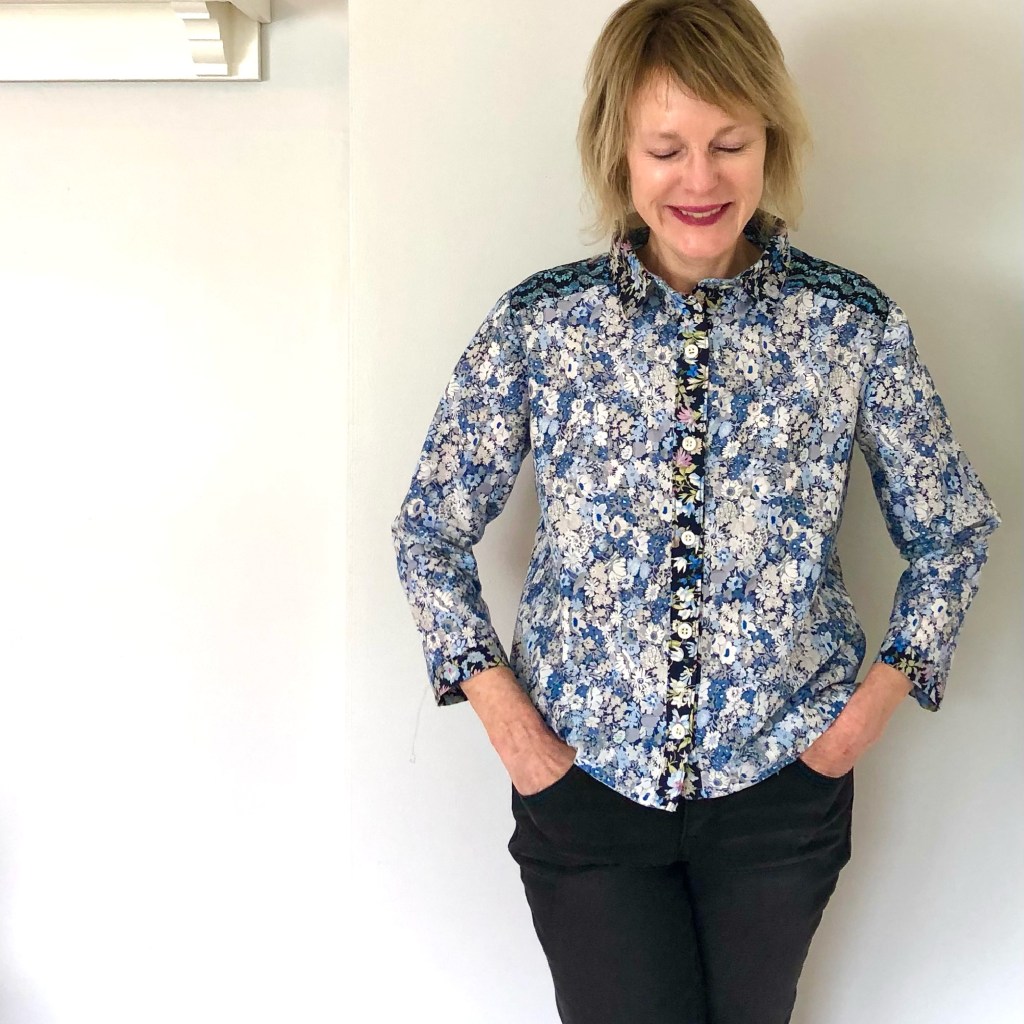 For my second attempt, I used a pattern that’s new this year, the Harriet Blouse, a pattern designed by Mijke of @sewitcurly. This pattern has so many details that make it perfect for pattern mixing! It has lovely curved yokes, deep cuffs and a rounded collar. I used two Liberty prints for this one.